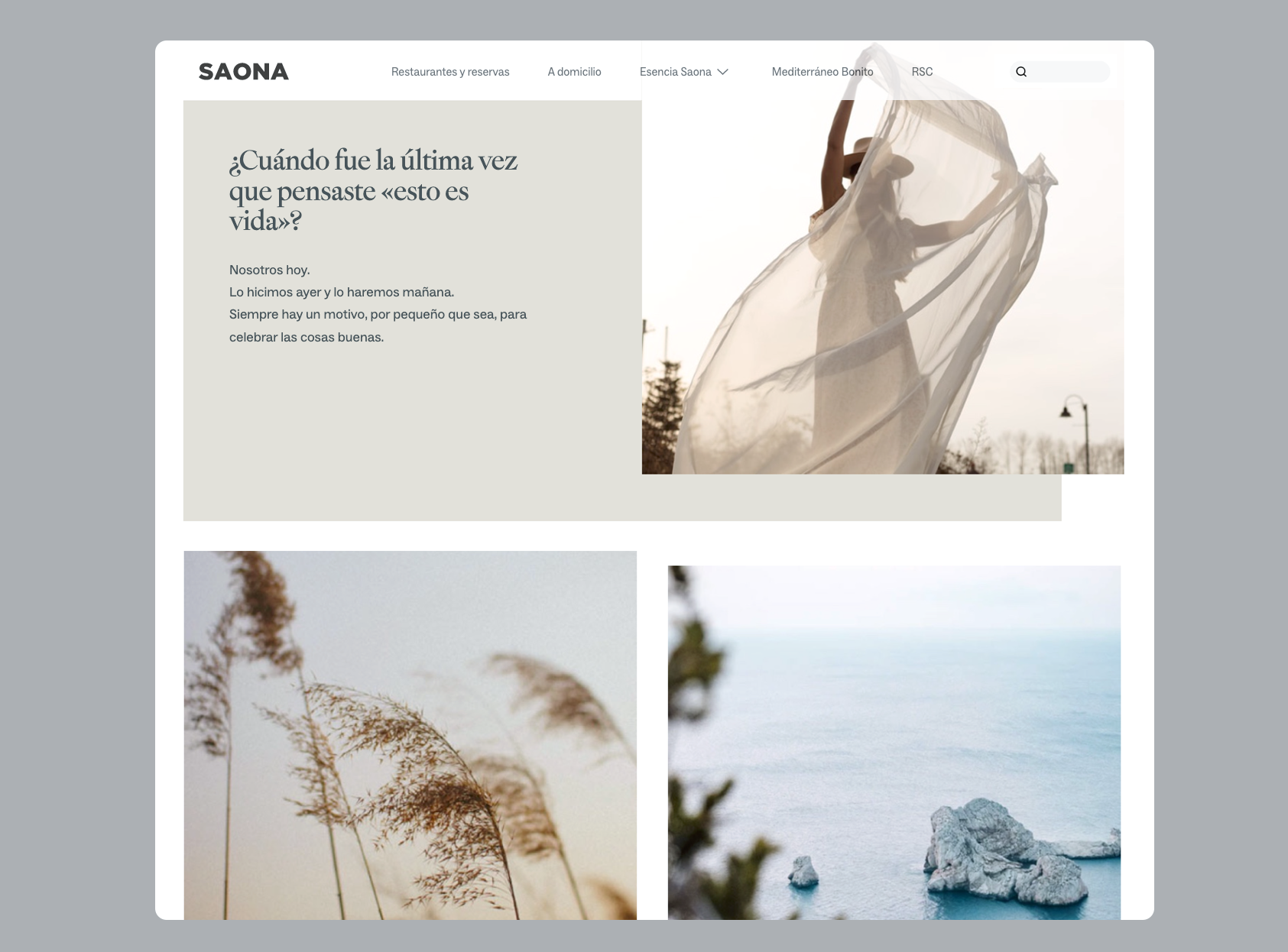 Tras 10 años de vida y con más de 50 restaurantes abiertos en toda España, Saona necesitaba un site que además de transmitir esa imagen de calidad y mediterránea tan caracteristica de la marca, fuese robusto, que fuese dinámico y ágil a la hora de consultar las cartas, que permitiese al usuario encontrar un restaurante en dos clicks y hacer que la experiencia en el entorno digital fuese igual de agradable que en el restaurante.